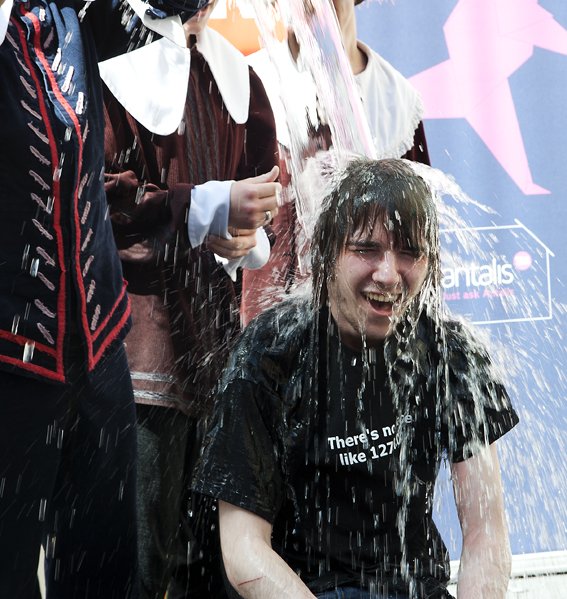 Unser "Ex-Lehrling" Stefan Messner wurde durch diesen Gautschakt von den Sünden seiner Lehrzeit reingewaschen und ist nun endgültig ein ehrbarer "Schwarzkünstler" und "rechtmäßiger Geselle" - ein richtiger "Sohn Gutenbergs".