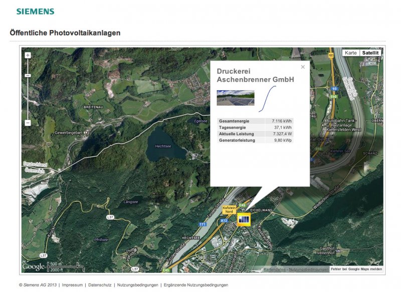 Der neue Internetseite der Firma Siemens macht es nun möglich, die momentane Leistung aller öffentlich gestellten Siemens-PV-Anlagen online abzurufen. Unsere am 12. August 2012 montierte Anlage haben wir natürlich sofort integriert. Einfach reinklicken und los geht´s. Noch eine kleine Info zu den Werten: